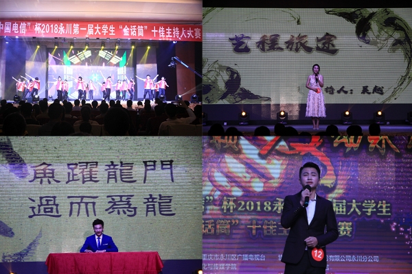 2018年6月1日下午,永川第一届大学生“金话筒”十佳主持人大赛决赛在永川区名豪酒店隆重举行。我校漆新贵副校长、万书辉副校长、重庆水利电力职业技术学院副校长陈吉胜、重庆财经职业学院副校长管军、重庆城市职业学院院副校长刘仲全、重庆科创职业学院党委副书记徐继义、重庆大学城市科技学院党委委员宣传部长吉春元、重庆传媒职业学院党委委员宣传部长孙永明、永川广播电视台台长曹伟,中国电信永川分公司副总经理龙浩、名豪国际酒店总经理张宇以及永川电视台、参赛选手学校教学部、学工部、团委、二级学院等负责人出席了此次比赛。