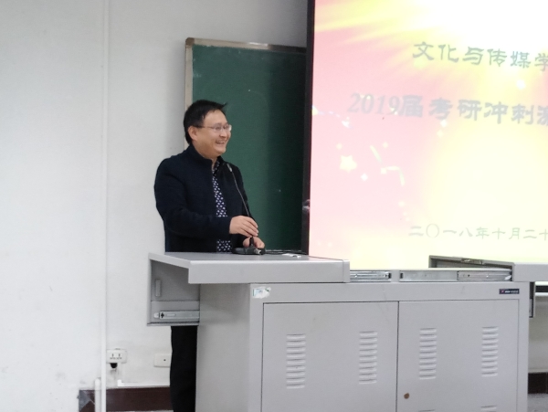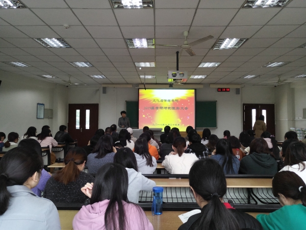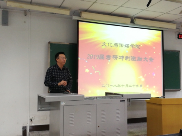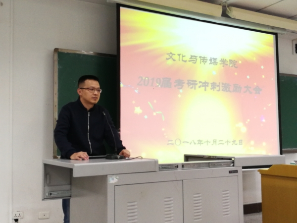 为强化澳门网投考研学生的考研积极性,让学生进一步坚定考研信心、明确目标、激发斗志。澳门网投于10月29日上午11点在知津楼D202举办了2019届考研冲刺激励大会。澳门网投关工委成员、全体领导班子成员、学工办主任刘友洪与2019届辅导员张雪、余建荣老师出席了大会。会议由文化与传媒学院党总支书记白成良主持,2019届80名考研学生代表参加了此次激励大会。