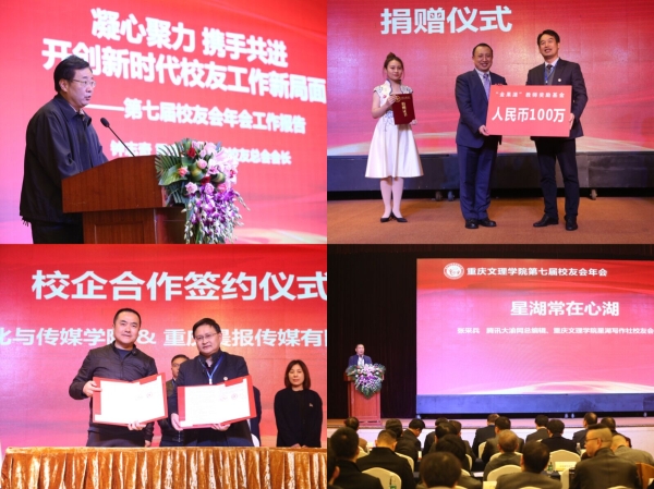 11月10日下午,由重庆文理学院校友总会主办,澳门网投和星湖写作社校友会联合承办的,以“创新·合作·共赢”为主题的第七届校友会年会暨星湖写作社成立25周年纪念活动在重庆渝中区两江丽景酒店隆重召开。校长黄伟九,副校长万书辉、金盛,校友总会会长钟志奇,重庆社科联党组书记杨清明,重庆科创职业学院院长戴伟,重庆幼儿师范高等专科学校党委书记刘灿国,文化与传媒学院相关负责人,校友总会常务理事、海内外70个校友分会的校友代表以及特邀企业嘉宾共260余人参会。大会由校友办主任、校友总会秘书长谢华琳主持。