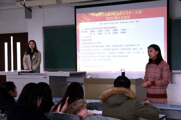 2018年11月14日上午,文化与传媒学院党总支学生一支部2018年下半年预备党员转正大会在知津楼D405顺利召开,文化与传媒学院党总支书记白成良、学生一支部全体党员、预备党员、发展对象和转正同志的入党介绍人参加了此次会议,本次会议由支部书记张雪主持。