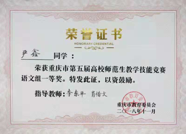 历经校级竞赛、市级赛前演练等多环节遴选与培训,澳门网投推荐汉语言文学(师范)专业2015级学生严鑫参赛。经过指导教师们的悉心指导和选手的奋力拼搏,荣获重庆市第五届高校师范生教学技能大赛一等奖。大赛由重庆市教委、重庆市教师教育联盟主办。