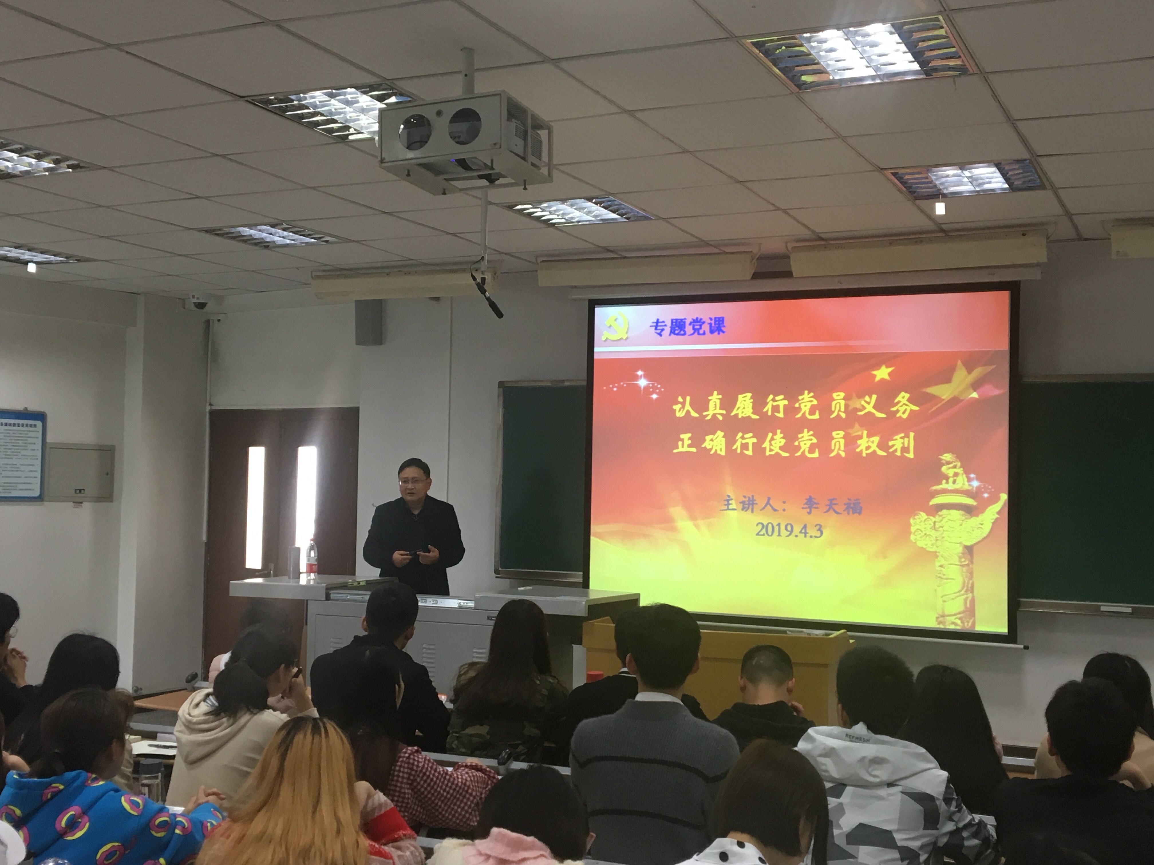 4月3日下午,澳门网投在知津楼D304开展了以“认真履行党员义务,正确行使党员权利”为主题的专题党课。院长李天福为党校学员和本期发展对象授课。