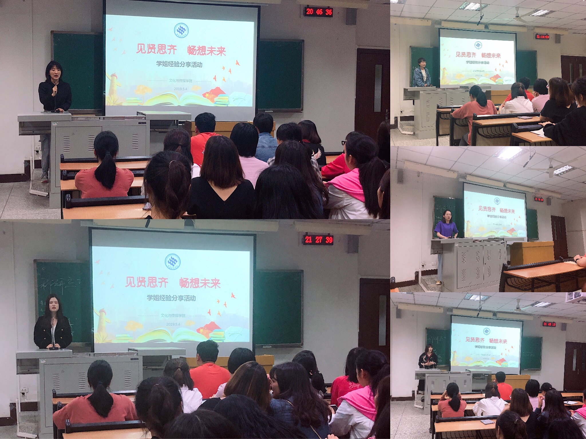 为促进2018级新生了解大学学习、考研、就业,进一步明确成长目标,5月4日晚,我院在知津楼D202举办了2015级优秀毕业生经验交流分享会。活动邀请到了5位优秀应届毕业生分享经验,她们分别是成功考取中国传媒大学研究生的李锦茹、考取吉林师范大学的郑博月、考取西南政法大学的李含芝、考取武汉体育学院的葛葭葭以及市大学生辩论赛优秀辩手温雪冰。本次分享会由辅导员刘友洪主持,2018级广播电视学专业全体学生参与。