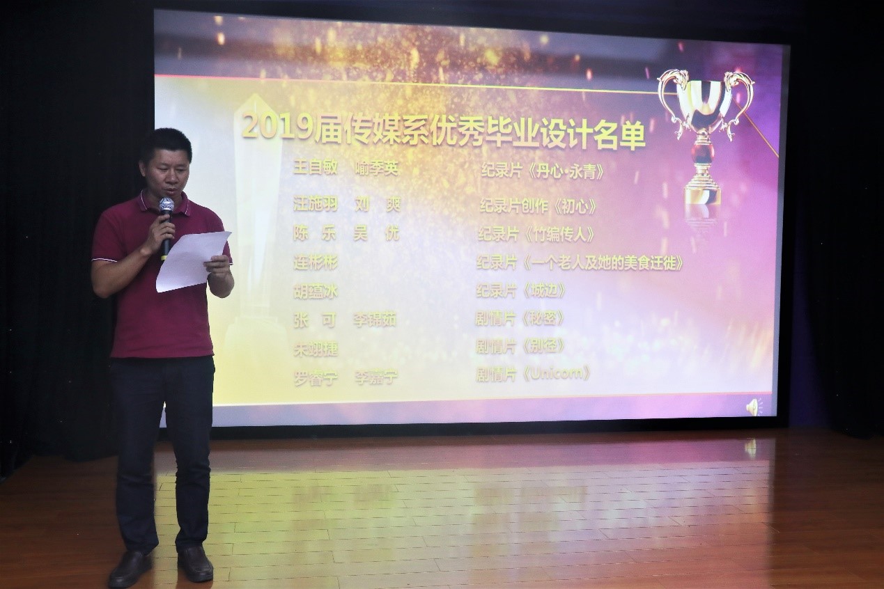 颁奖典礼后,大家集中观影了本年度优秀作品代表作《列车将至》。主持人灿公布了部分2019届传媒系优秀毕业设计名单放映了本届毕业设计作品代表作《Unicorn》《竹编传人》《城边