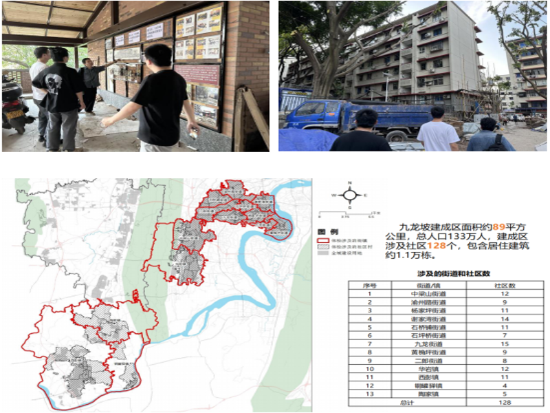 我校通过“校地合作”方式推动城市更新,聚焦“九龙街道、谢家湾街道片区改造”,旨在优化提升社区功能和空间品质,推动社区经济发展、提升居民生活品质,实现产学研一体化的深度融合。课题组引导学生下沉社区,对重庆市九龙坡区九龙街道以及谢家湾街道下属社区基层上报数据进行检查复合工作,确保社区基层数据的真实性、有效性、可靠性。在课题调研初期,课题组为同学们讲解了城市体检项目背景由来、项目具体实施情况以及项目预期。社区基层数据复核工作中,同学们对社区整体数据有一定判断后,走进基层社区委员会进行数据核实工作,在此过程中发现多处空间区域范围绘制不明确,上报内容不完整、调查报告提案内容较为空泛、工作量巨大而繁杂、相关数据收集核实存在较多困难。同学们与课题组克服实际困难,与社区相关负责人积极复核上报数据内容,项目实施较为顺利。