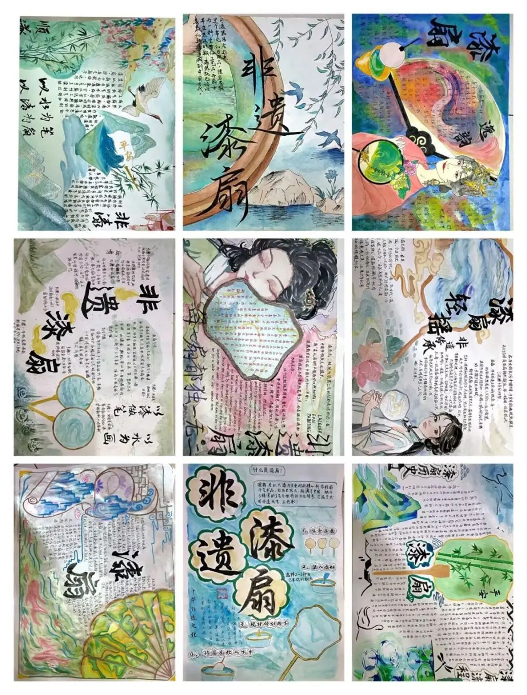 两小时后,一把把精美漆扇诞生,风格多样,清新淡雅如春日微风,绚丽多彩似夏日繁花,古朴典雅若秋日山林,深沉厚重像冬日暖阳,凝聚着同学们的创意与情感。