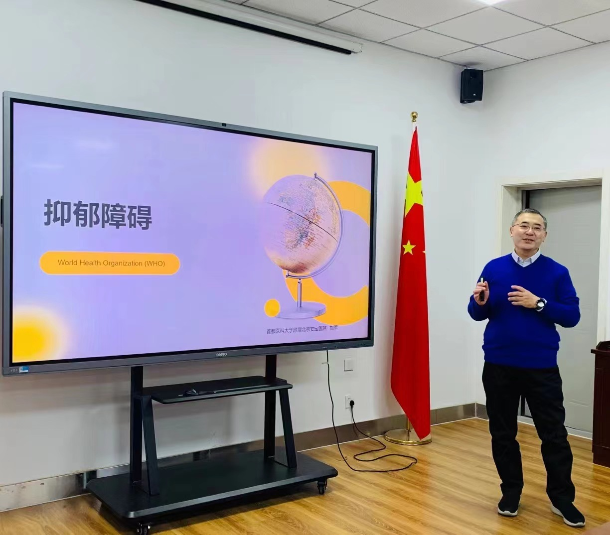 2023年10月20日上午,中国心理学会临床心理学注册工作委员会委员(伦理组)、首批中国心理学会临床心理学注册工作委员会注册督导师(D-06-043)、中国心理卫生协会首批认证督导师(XXD-2020-051)、中国社会心理学会婚姻与家庭心理学专业委员会委员、中国心理卫生协会心理治疗与咨询专委会家庭治疗学组(第三届)委员、中国心理卫生协会性心理健康专委会常委、北京心理卫生协会心理治疗与咨询委员会常务委员刘军老师应邀做客“心理健康大讲堂”,为bat365师生做了题为《抑郁障碍——世界卫生组织的应对》的学术讲座。副院长金童林主持讲座。