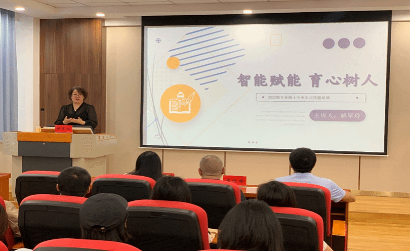 随后,指导教师解翠玲为实习生开展了一场题为“智能赋能,育心树人”的教育实习技能培训。解老师结合自身实习指导经验着重强调了心理学专业教育实习目标,详细介绍了课堂教学、学生管理及心理辅导等实习主要内容,还与时俱进地分析了网络时代中学生心理特征,提醒实习生要依据学生特点因材施教,按照学生需求确定教学目标,挖掘教学内容内涵实施教学设计,结合心理学科特点选择教学模式。