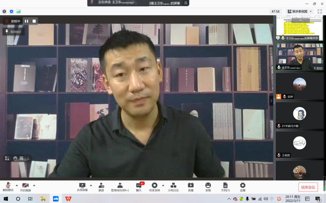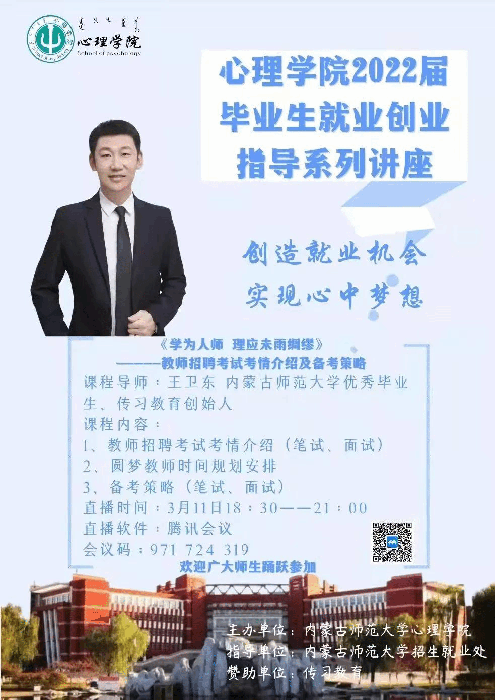 为贯彻党中央、国务院“稳就业”“保就业”决策部署,落实学校推进毕业生就业工作要求,促进bat365毕业生高质量就业。2022年3月11日,bat365官方网站特邀请优秀校友、传习教育创始人王卫东为同学们开展“《学为人师 理应未雨绸缪》--教师招聘考试考情介绍及备考策略”专题讲座,学院党委副书记副院长张晓阳参会,学生工作与就业指导办公室主任张金钟主持。