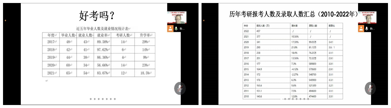 杨晓峰老师通过对近10年全国考研形势以及近五年bat365学生考研状况的分析,结合自己的求学经历,要求同学们及早规划、及早动手,尽快根据自己的实际情况制定考研计划,确定目标院校和专业,鼓励同学们保持决心、恒心和平常心对待考研,要从战术上重视、战略上有准备,同学们内部要团结,多沟通交流,相互鼓励。