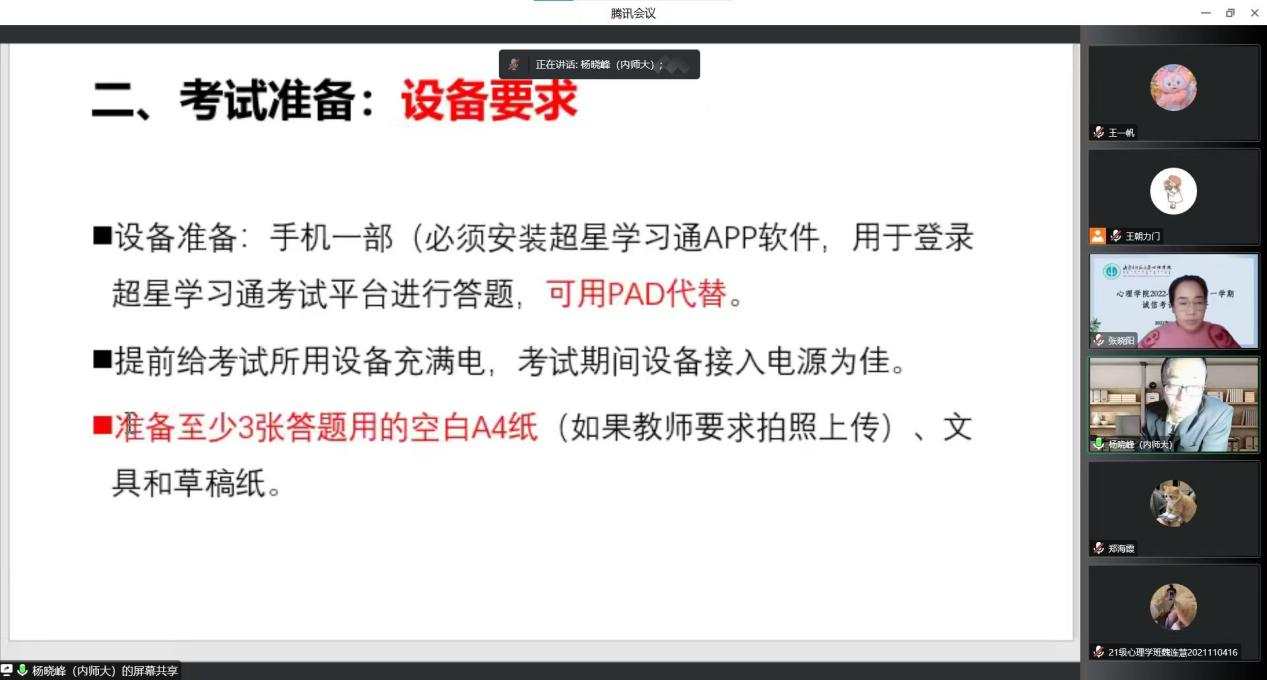 会上,杨晓峰进行了考前复习指导及考试重要事项提示,要求学生诚信考试,树立良好学风;王朝力门详细讲解线上考试流程、平台使用方法及突发特殊情况的应对处置等,确保学生们顺利进行考试。