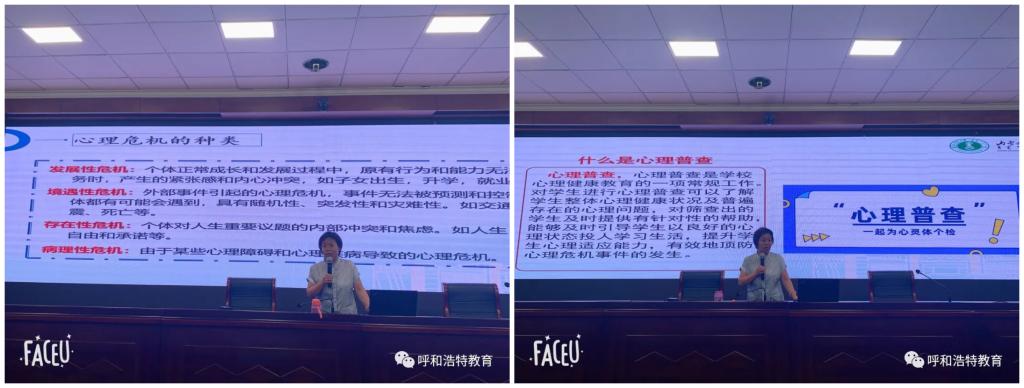为全面提升我市中小学心理健康教育和研究水平,提高学生心理素质,进一步推进我市中小学心理健康教育工作。2022年6月24日下午,呼和浩特市教育局在市第二中学如意校区举办了全市中小学心理健康教师及班主任危机干预专题培训。全市各中小学心理健康教师、班主任共5000余人参加了培训。培训采取“线上+线下”相结合的模式进行。