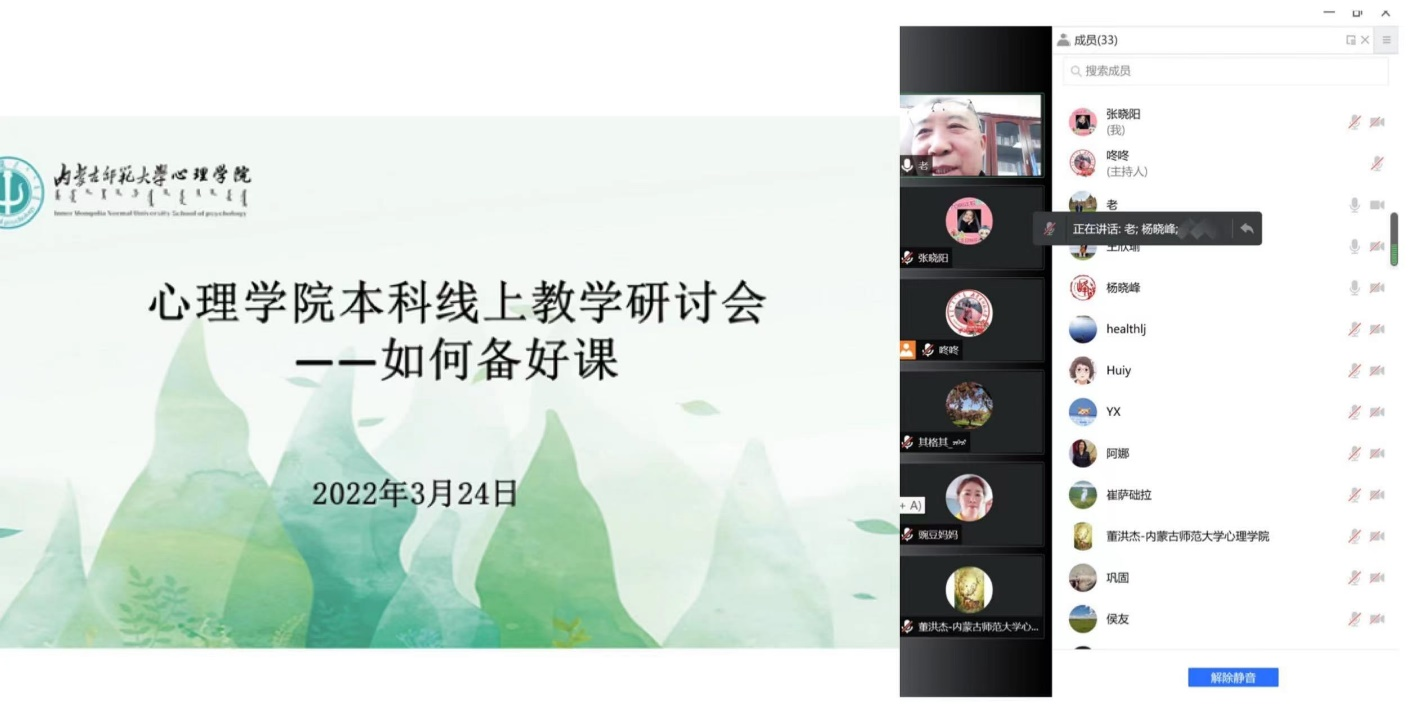 为了进一步提升线上教学效果,促进本科教学质量,3月24日下午,在各教研室充分开展线上教学研讨的基础上,bat365官方网站召开“如何备好课”——本科线上教学研讨会。学院党委书记七十三、院长乌云特娜、党委副书记张晓阳、副院长侯友及全体教师参加。心理学系主任杨晓峰、中学教育心理学教研室主任解翠玲、职业教育心理学教研室主任董洪杰、心理健康教育教研室主任赵媛分别做了经验交流和分享。
