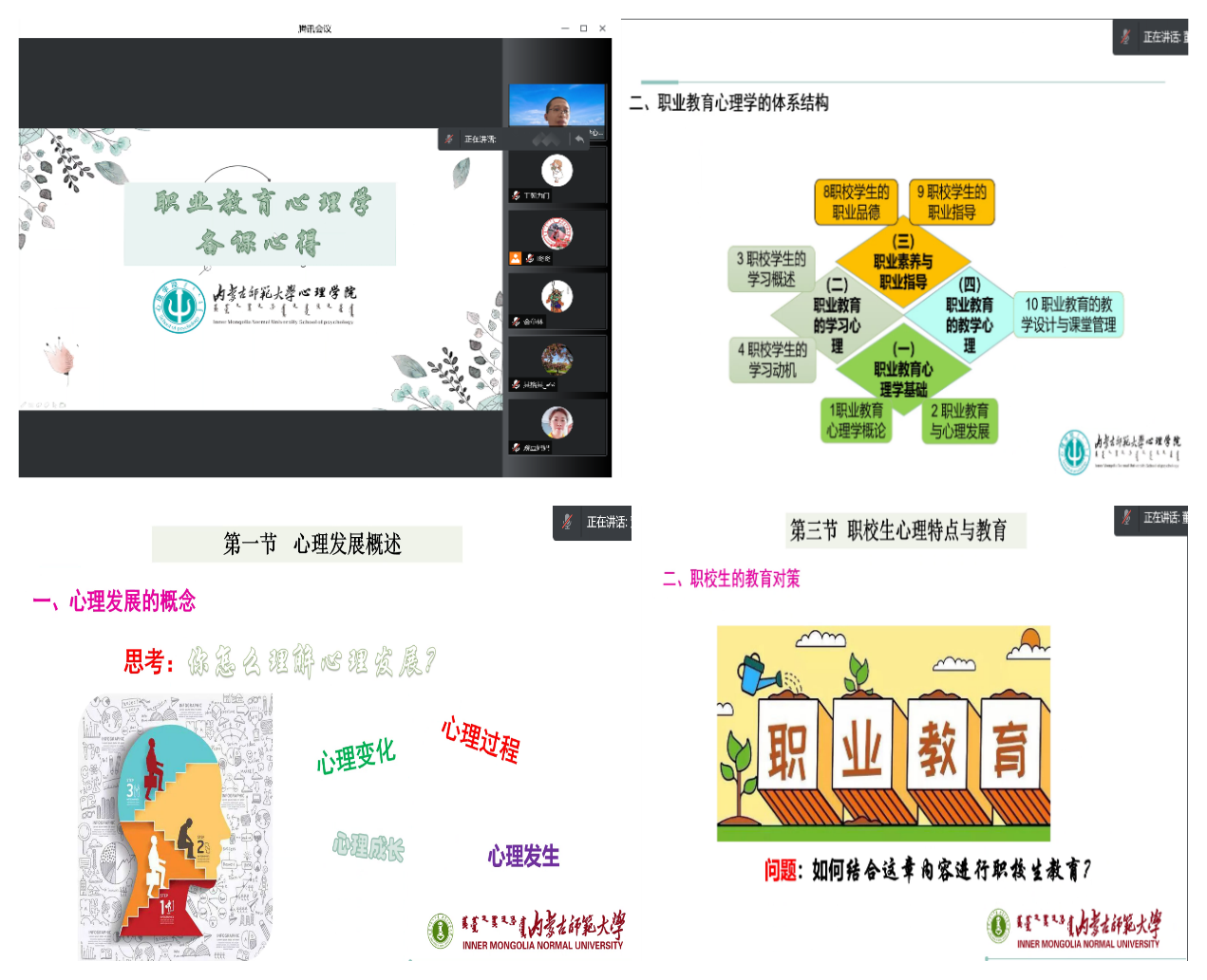 解翠玲老师从《中学教育心理学》公共课开学前的集体备课,教案、课件、题库、教学视频、扩展文献等线上教学资源的完善等方面做了分享。线上课程建设与教学设计方面,教师按照自己的教学需求把资源编排到课程当中。将电子版教材、短视频等资源利用学习通布置给学生学习。教研室的老师们齐心协力建立完善题库,并在学习通里任意组合试卷,方便课堂测试。教学活动设计与实施方面,将本课程与教师资格证考试和教师招聘考试结合,调整教学重难点。针对公共课性质,老师们想方设法提高每一节课的效率,提高学生的趣味性,让学生尽可能的在课程上有更大收获。