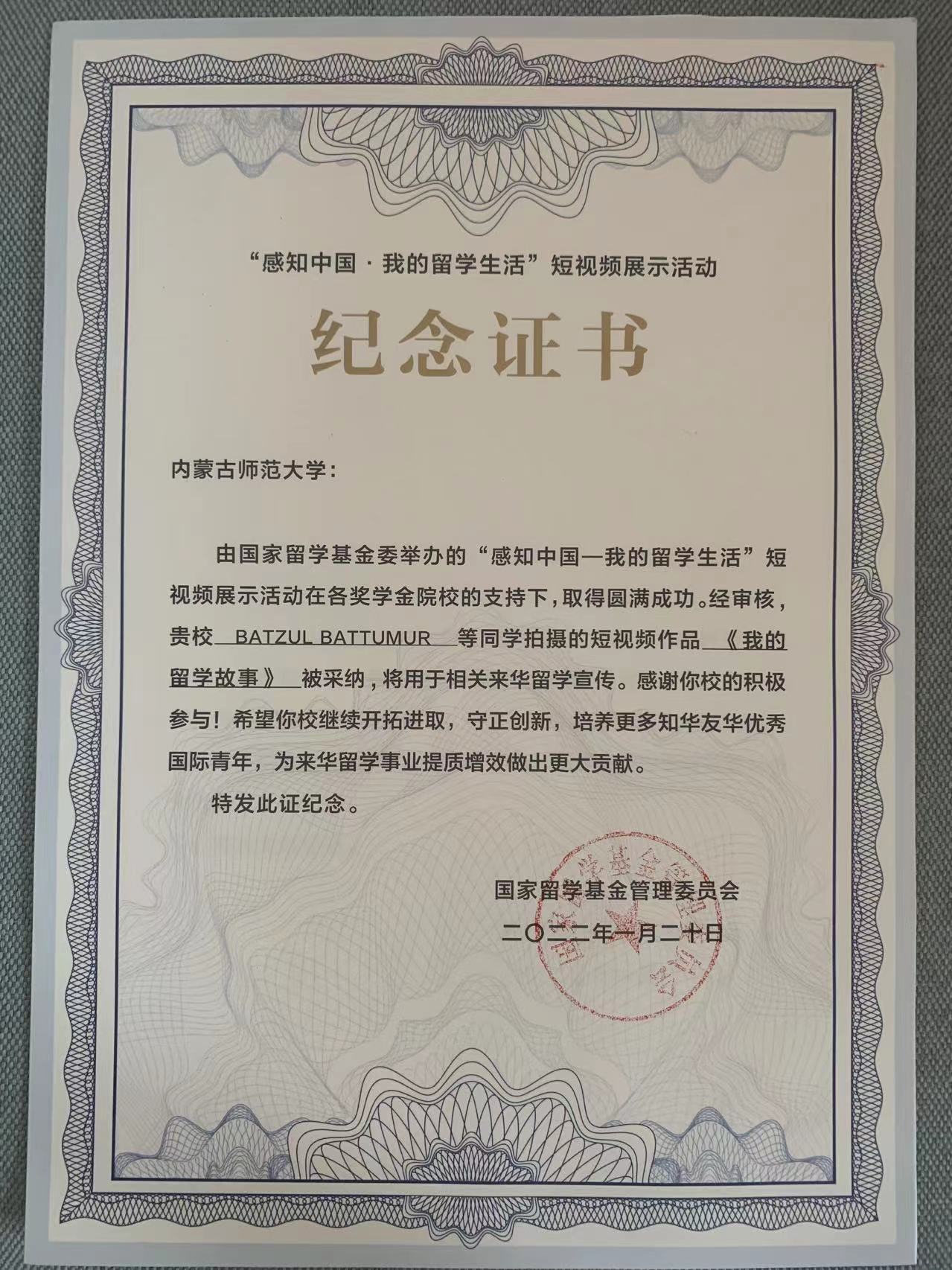 近日,bat365留学生BATZUL BATTUMUR同学拍摄的短视频作品《我的留学故事》在国家留学基金委举办的“感知中国——我的留学生活”短视频展示活动中被采纳,将用于相关来华留学宣传。