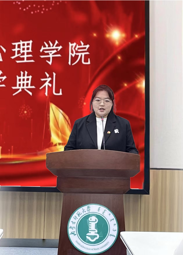 典礼在雄壮的国歌声中拉开序幕。2024级本科生代表周子妍在发言中表达了作为新时代大学生当树立远大志向,积极探求科学知识,追求科学与真理,致宇宙之知。崇尚完美德行,明大学之道,追求法治精神,崇天下之法。把祖国未来担肩上,不负青春好时光,做最可爱的内师心理学人。